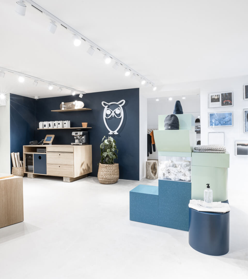 Our groundbreaking shop-in-shop setups are currently being introduced across Europe and will later be expanded to other continents. The shop fittings are made of organic and recycled materials, featuring a minimalist design that reflect the brand’s sustainability profile. All materials used are CSR approved and we have ensured that the materials and production sites meet the requirements of the certifications that KnowledgeCotton Apparel complies with. A key feature is that all inventory can be returned and recycled once it is discarded.